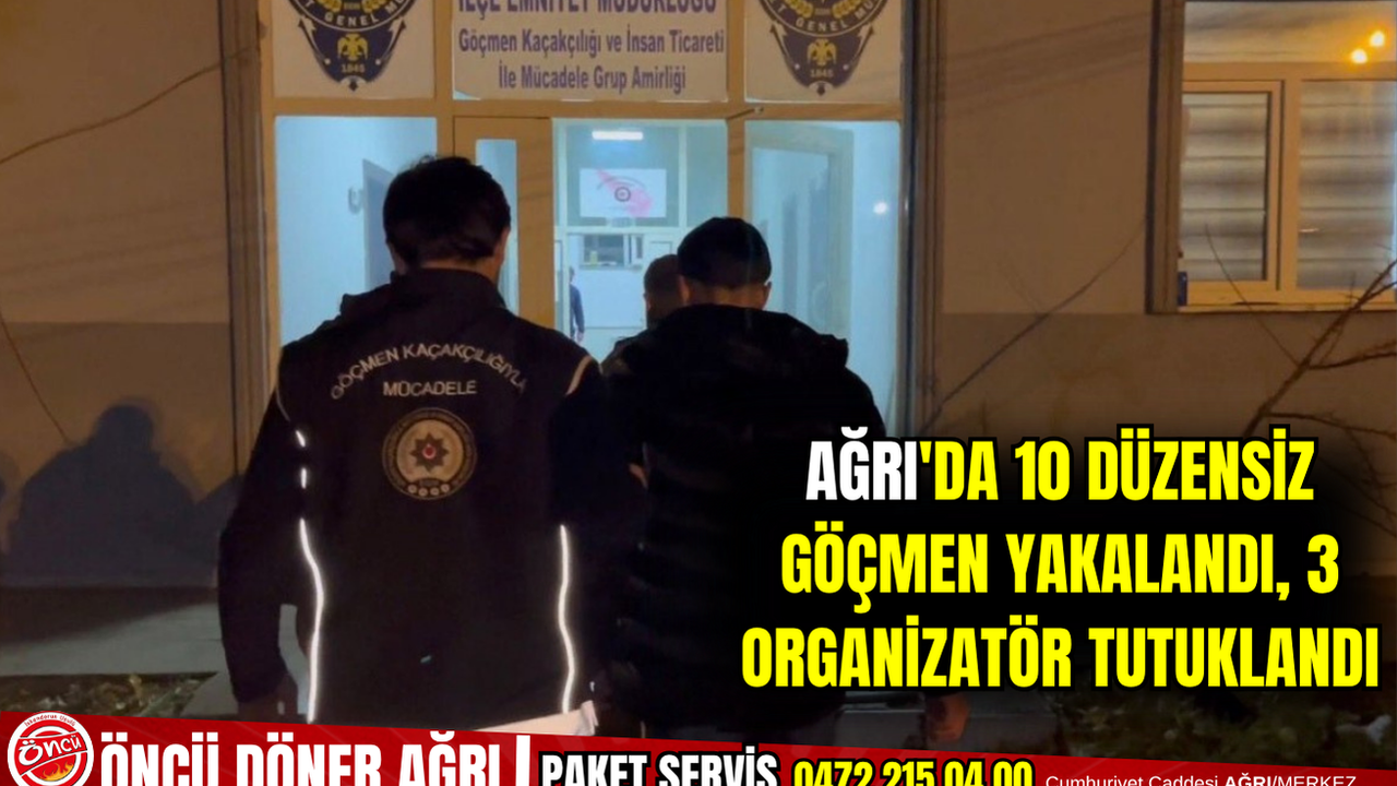 Ağrı İl Emniyet Müdürlüğü ekipleri, Doğubayazıt ilçesinde düzensiz göçle mücadele kapsamında 2 ayrı adrese eş zamanlı operasyon gerçekleştirdi. Yapılan baskınlarda 10 düzensiz göçmen ile 3 şüpheli organizatör yakalandı. Gözaltına alınan 3 organizatör, emniyetteki işlemlerinin ardından sevk edildikleri adliyede çıkarıldıkları tutuklanarak cezaevine gönderildi.