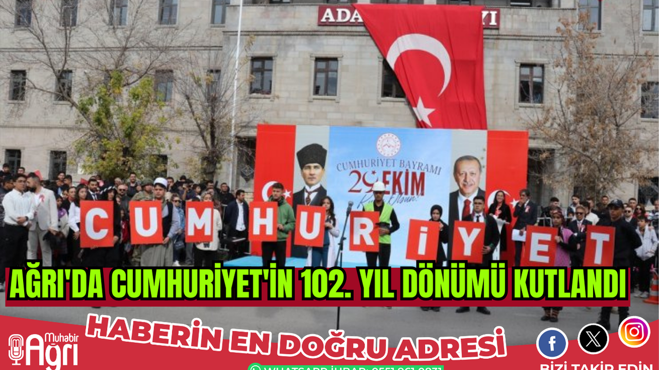 Ağrı'da, 29 Ekim Cumhuriyet Bayramı ve Cumhuriyet'in 102. yılı etkinlikleri kapsamında Adliye binası önünde tören düzenlendi. Askeri, öğrenci ve araç geçit töreni yapıldı.