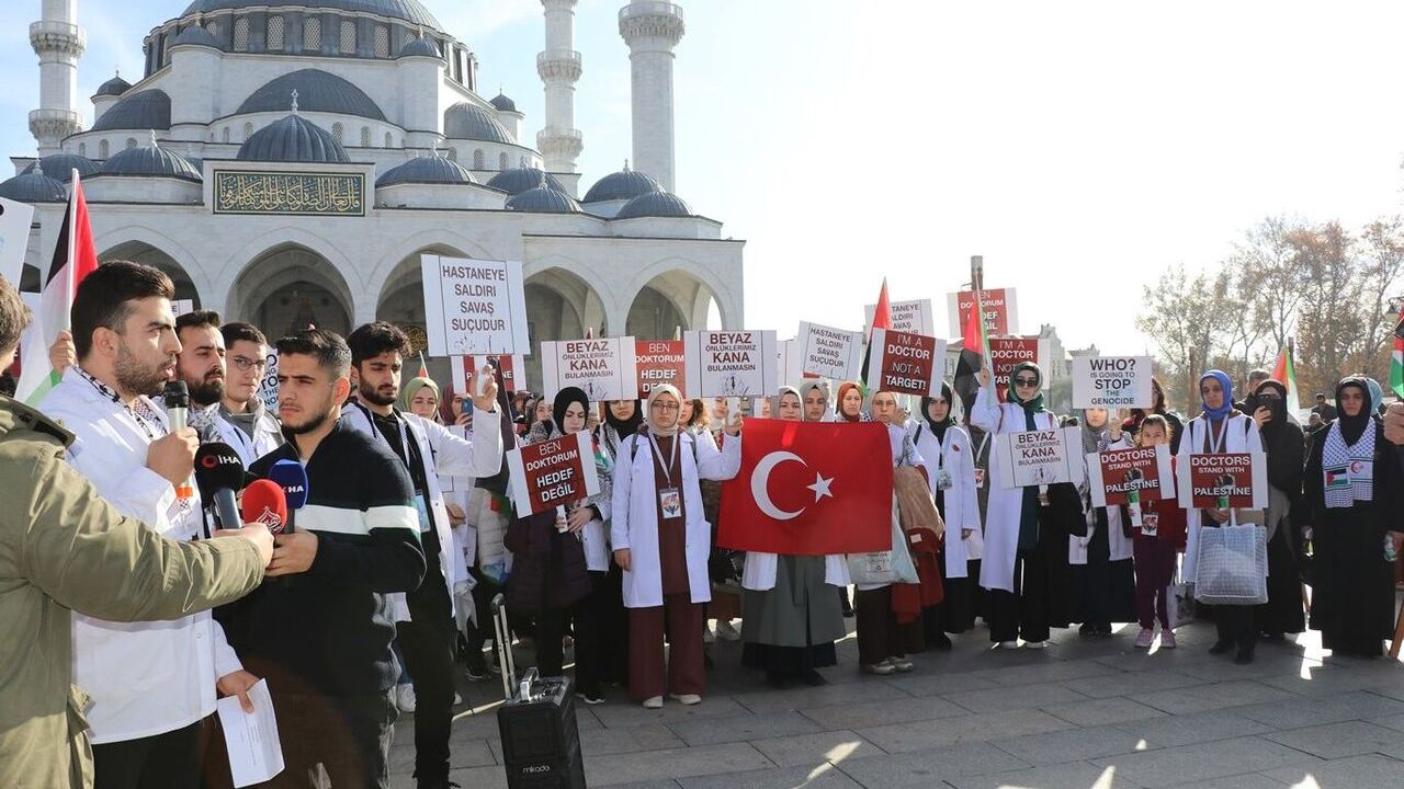 Filistin'de yaşanan katliamlara dur demek için birinci TBMM binası önünde toplanan hekim ve hekim adayları beyaz önlükleri ile Melike Hatun Camisine kadar sesiz yürüyüş düzenlediler.