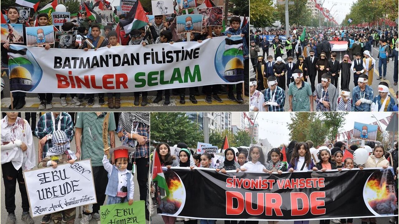 Batman İslami Sivil Toplum Kuruluşları öncülüğünde bir araya gelen binlerce çocuk, siyonist işgal rejiminin Gazze'deki bebek ve çocuk katliamlarını düzenledikleri kitlesel yürüyüşle protesto etti.