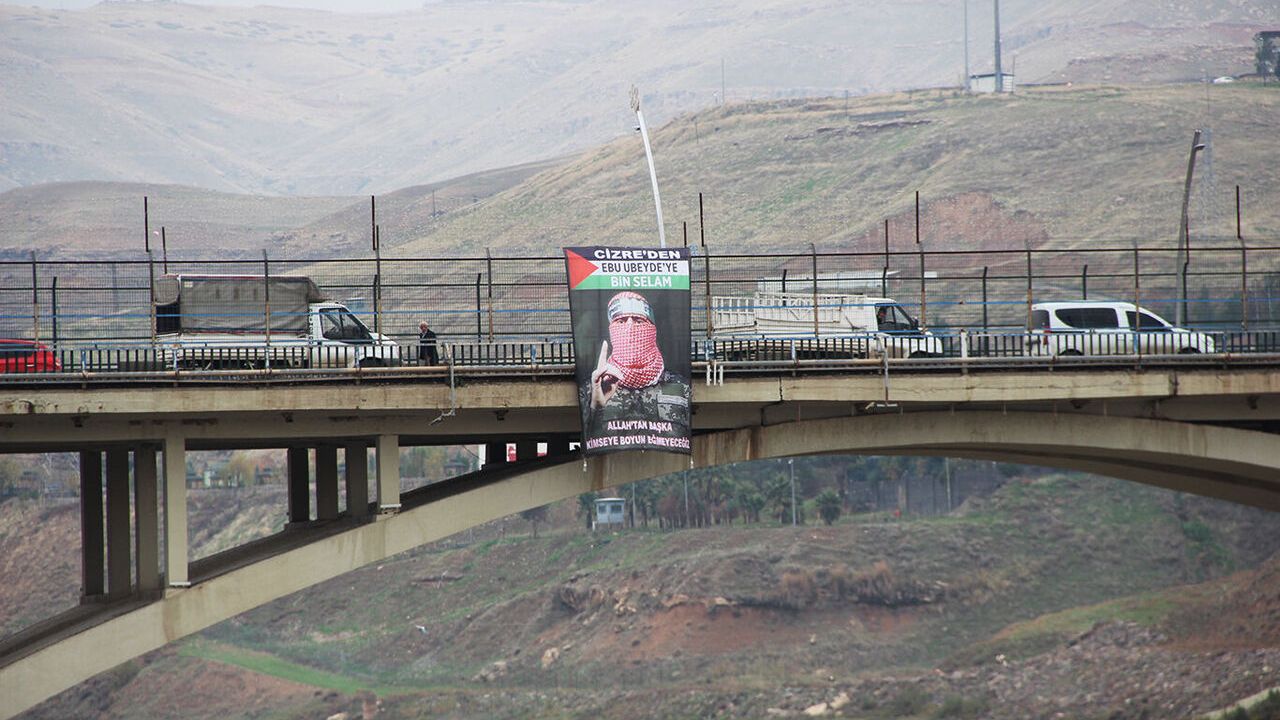 Şırnak'ın Cizre ilçesinde bulunan Mehmetçik (Kenedy) Köprüsüne bir grup vatandaş tarafından, Filistin ve HAMAS'ın mücadelesine destek amaçlı Ebu Ubeyde'nin "Cizre'den Ubeyde'ye Bin Selam" yazılı posteri asıldı. (İLKHA)