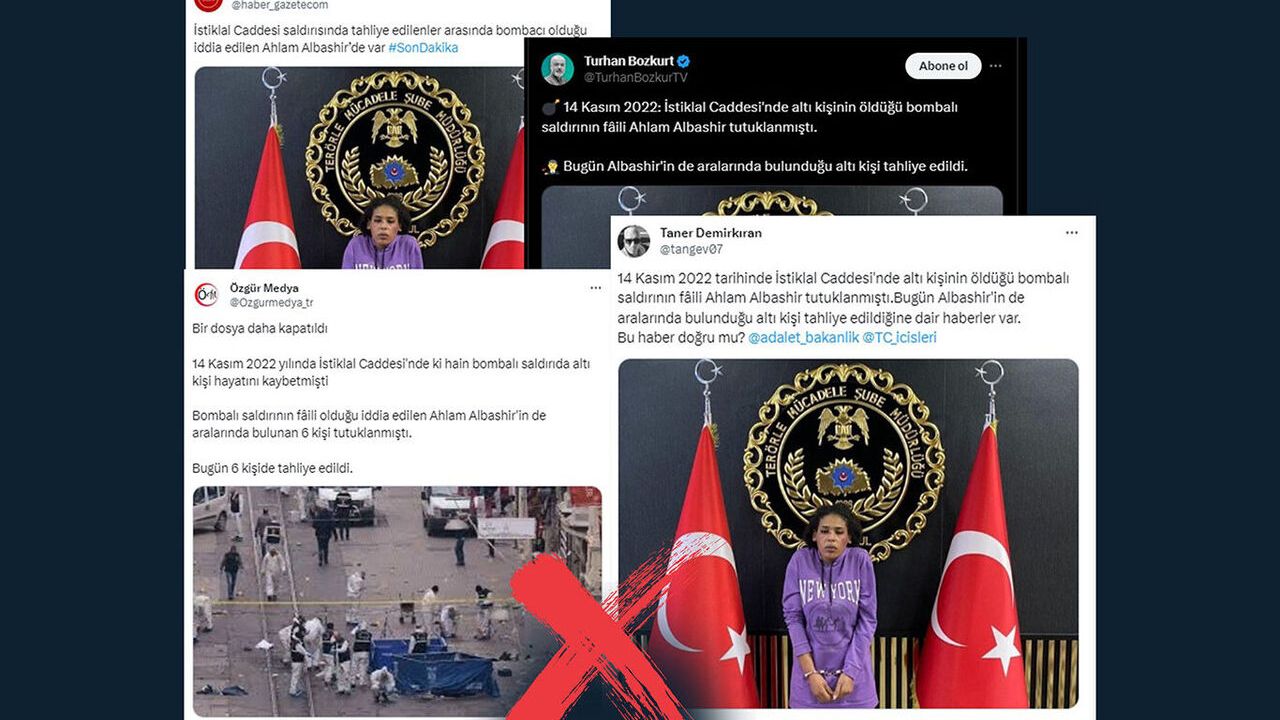 "Bazı sosyal medya hesaplarından paylaşılan, 'İstiklal Caddesi'nde altı kişinin öldüğü bombalı saldırının faili Ahlam Albashir tahliye edildi' iddiası doğru değildir.