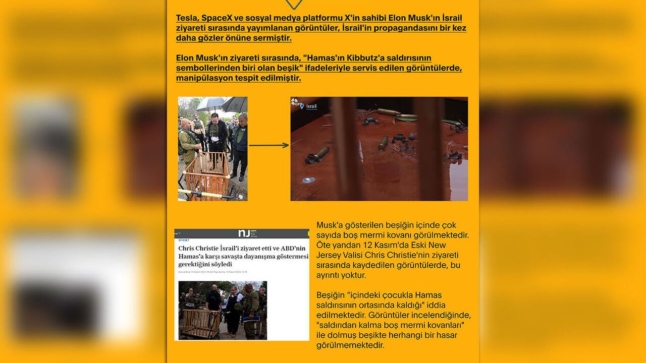 Elon Musk'ın ziyareti sırasında, "Hamas'ın #Kibbutz 'a saldırısının sembollerinden biri olan beşik" ifadeleriyle servis edilen görüntülerde de, manipülasyon tespit edilmiştir.
