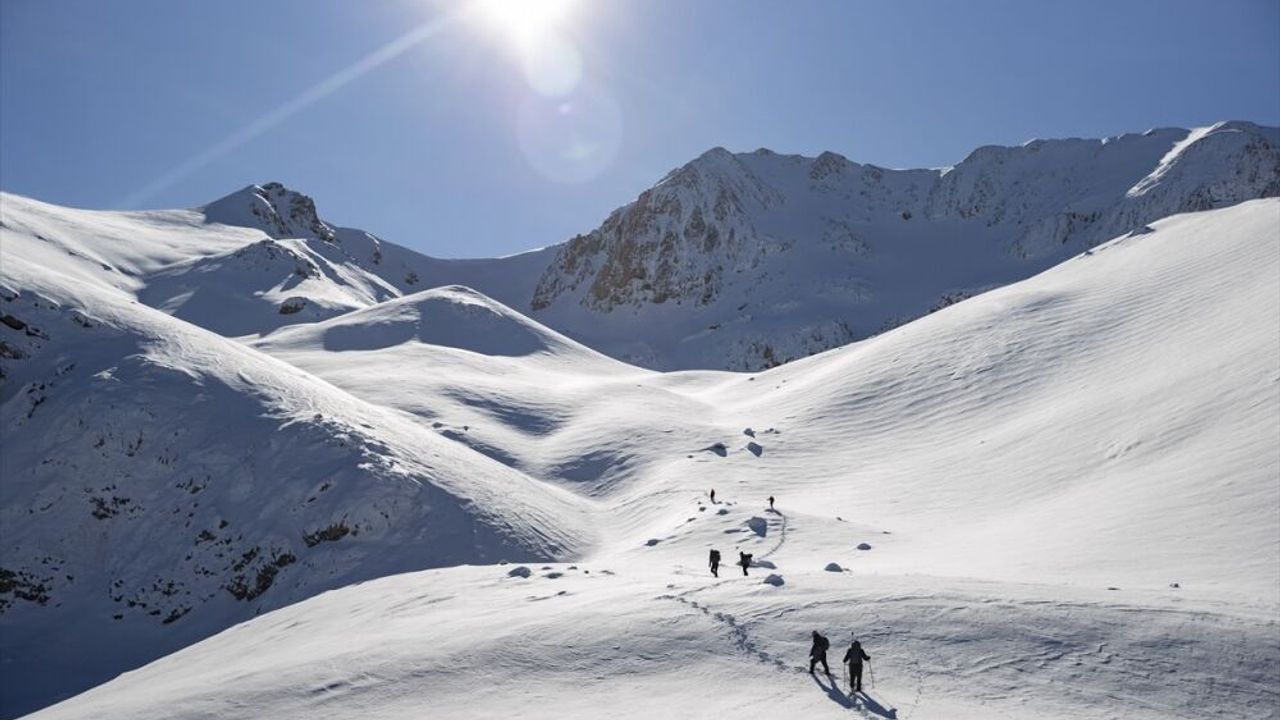 Kar kalınlığının 1 metre olduğu arazide ilerleyen dağcılar, yaklaşık 6,5 saat tırmanış yaptıktan sonra hedefledikleri noktaya ulaşıyor.