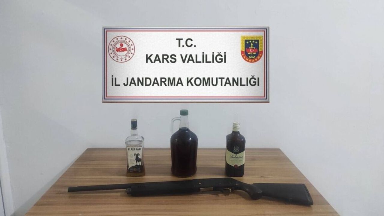 Operasyonda, 3 litre el yapımı viski, hazırlanan sahte içkilerin doldurulması amacıyla kullanılan şişeler ve ruhsatsız av tüfeği ele geçirildi.