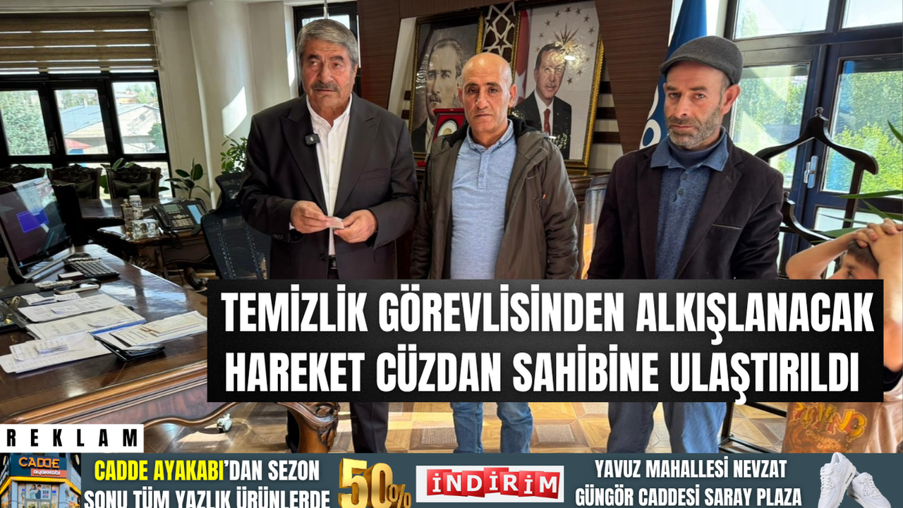 Ağrı’nın Patnos ilçesinde temizlik görevlisi olarak çalışan Mahsun Çengir, görevde olduğu sırada yerde bulduğu cüzdanı sahibine ulaştırılmak üzere Patnos Belediye Başkanı Abdulhalık Taşkın’a teslim etti. İçerisinde bir miktar para bulunan cüzdan, kısa sürede sahibine ulaştırıldı.