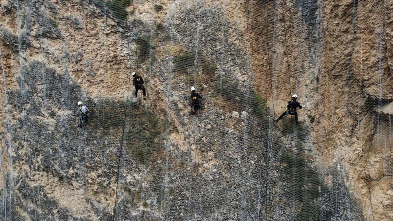 Profesyonel dağcılardan oluşan ekip, halatlar yardımıyla tırmandıkları yamaçlarda riskli kayaları düşürerek çelik ağın yamaca sabitlenmesi için belirlenen 1144 noktaya delik açtı.