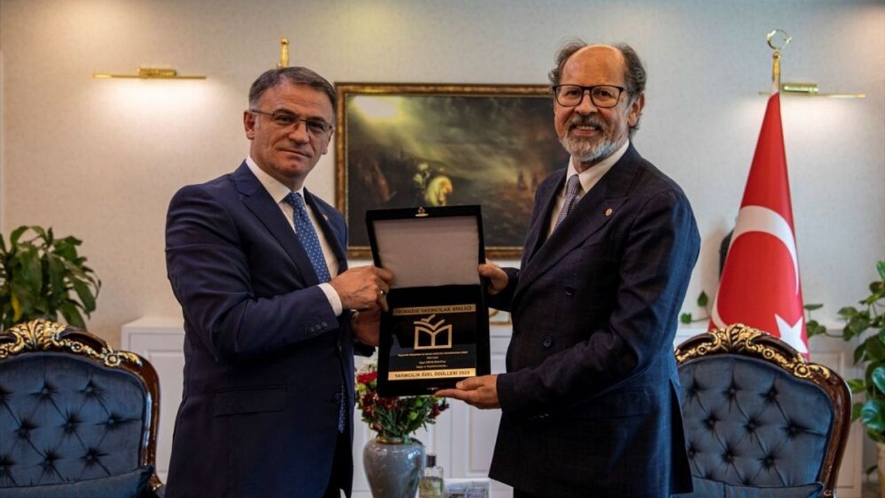 Türkiye Yayıncılar Birliği Başkanı Kenan Kocatürk, makamında ziyaret ettiği Balcı'ya ödülünü teslim etti.