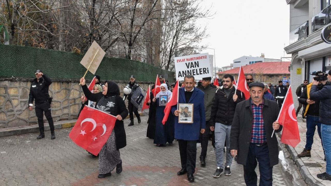 Menekşe Sokak'ta bir araya gelen aileler, "Evlat nöbetindeyiz", "Artık yeter, yakamızdan düşün", "Şehidime dokunma, onlar bize emanet", "Çocuklarımız kimsenin piyonu olmayacak" ve "Van anneleri evlat nöbetinde" yazılı dövizler taşıdı.